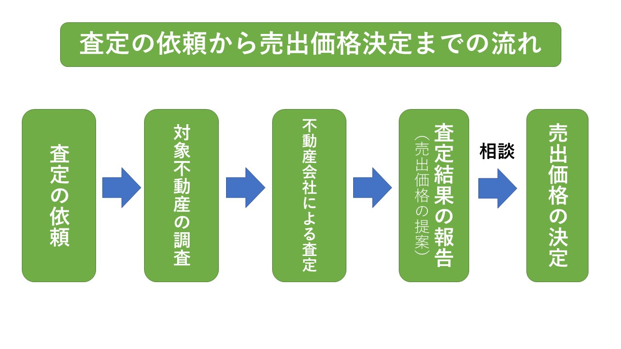 査定依頼→対象不動産の調査→不動産による査定→査定結果の報告→売出価格の決定